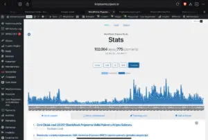 Prikaz nadzorne ploče WordPressa za kriptoentuzijasti.io s fokusom na statistiku popularnih postova. Uključuje ukupne preglede, komentare, vremenski grafikon interakcija te sekcije Najgledanije, Najkomentiranije i Trenutno popularno.