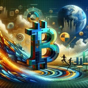 Ova dinamična slika prikazuje Bitcoin simboliziran živopisnim, geometrijskim blokovima na pozadini svijeta, uz grafičke elemente poput grafikona rasta i siluete trkača. Elementi ilustriraju globalni utjecaj kriptovaluta i njihovu ulogu u modernom financijskom tržištu.