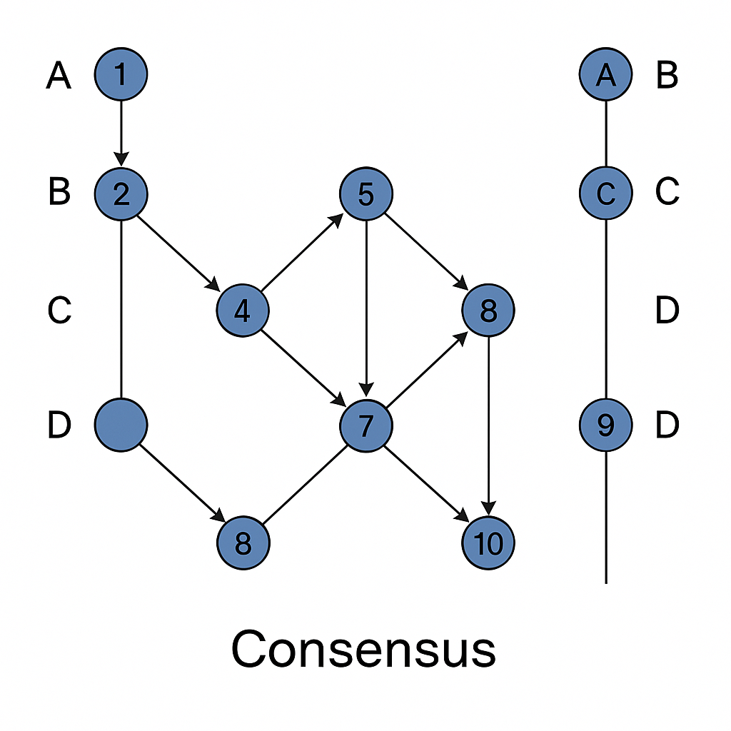 Na dnu grafa možeš primijetiti kako se svi putevi konvergiraju ka centralnim čvorovima – to simbolizira trenutak konsenzusa. U tim tačkama svi čvorovi mreže znaju za sve bitne događaje i suglasni su o njihovom redoslijedu.