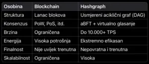 Tablica usporedbe Blockchaina i Hashgrapha na temelju strukture, konsenzusa, brzine, energije, finalnosti i skalabilnosti. Blockchain koristi lanac blokova s ograničenom brzinom i energijom, dok Hashgraph koristi DAG za brže, efikasnije i skalabilnije operacije.