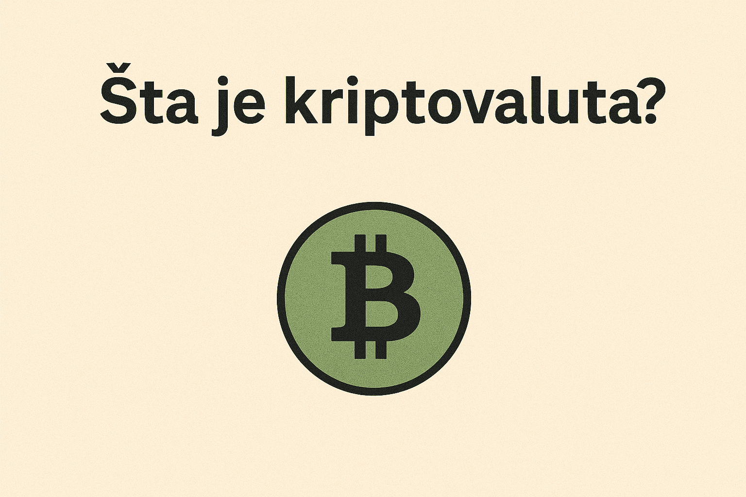 Minimalistička edukativna slika s natpisom Šta je kriptovaluta? na bež pozadini i velikim zelenim krugom sa crnim simbolom Bitcoina u sredini, naglašava temu kriptovaluta za informativne svrhe.