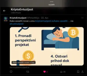 Snimka zaslona s društvene mreže prikazuje objavu Petara Miljića o pasivnom prihodu uz kriptovalute. Lijevo su ilustracije povećala i ruke s kovanicom, desno čovjek kako spava dok Bitcoin simbol lebdi. Tekst nudi pronalazak projekata i prihod tijekom sna.