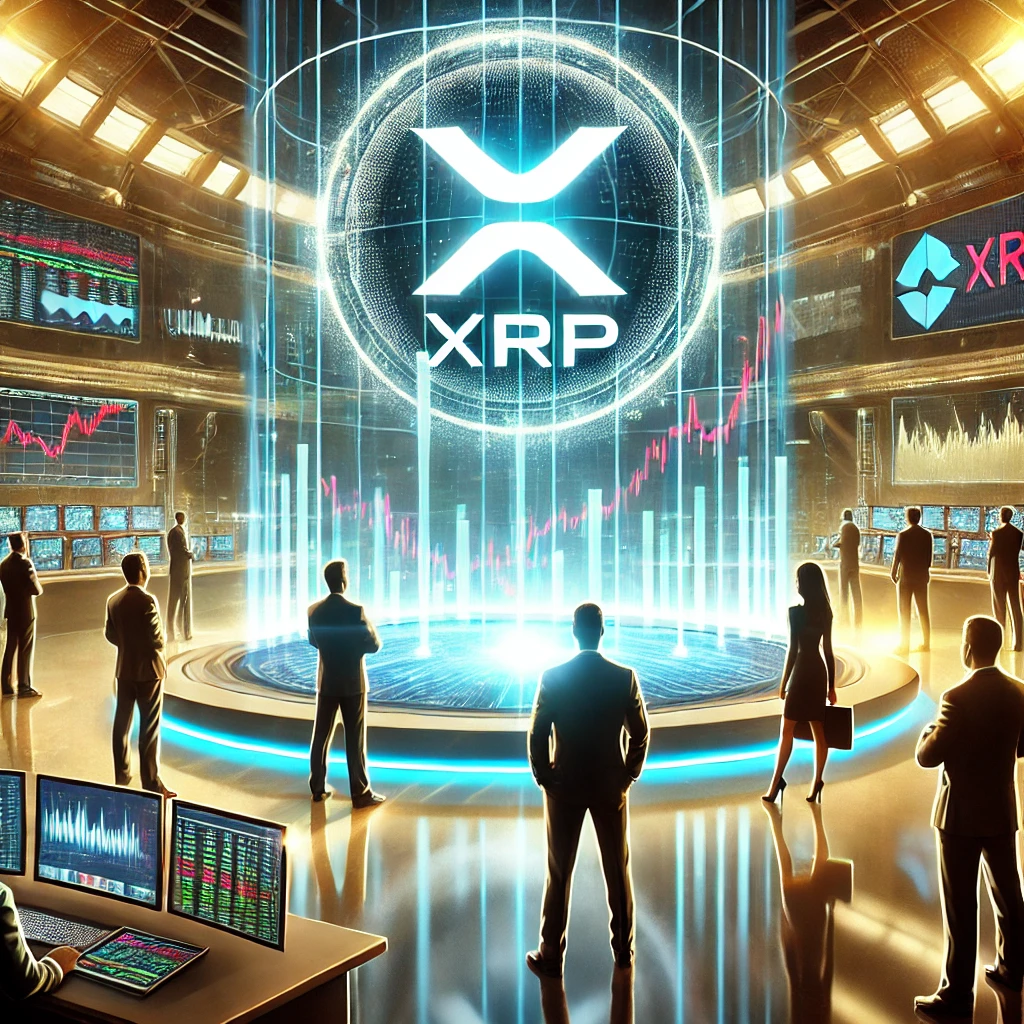 Futuristička trgovinska soba s centralnim holografskim prikazom XRP-a, okružena poslovnim ljudima koji analiziraju dinamične tržišne trendove. Prostor osvijetljen plavim neonskim svjetlom, s visokokvalitetnim zaslonima koji prikazuju financijske grafikone i statističke podatke.