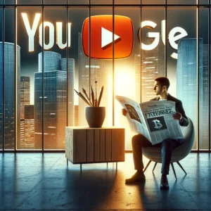 Moderni grad s futurističkim neboderima nalazi se kroz stakleni prozor elegantnog prostora. Muškarac u odijelu opušteno čita novine u minimalističkom naslonjaču, dok dekorativna biljka donosi dašak prirode. Dominira velikim logotipom YouTube i Google, simbolizirajući digitalne inovacije.