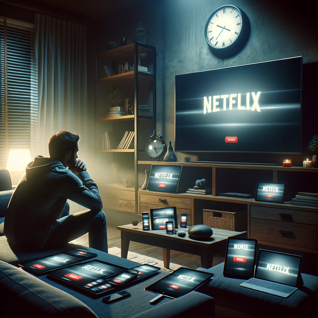 U modernom dnevnom boravku, dimno osvijetljenom svjetlima digitalnih uređaja, osoba se opušta na kauču, uronjena u svijet Netflixa. Prostor je ukrašen knjigama i dekorativnim predmetima, stvarajući ugodnu atmosferu za uživanje u digitalnom sadržaju.