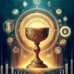 Zlatni kalež sjaji na reflektirajućoj površini, okružen geometrijskim simbolima koji spajaju drevnu mudrost i digitalnu tehnologiju. Pozadina u dubokim nijansama plave i tirkizne stvara mističnu atmosferu, naglašavajući kontrast između starog i modernog.