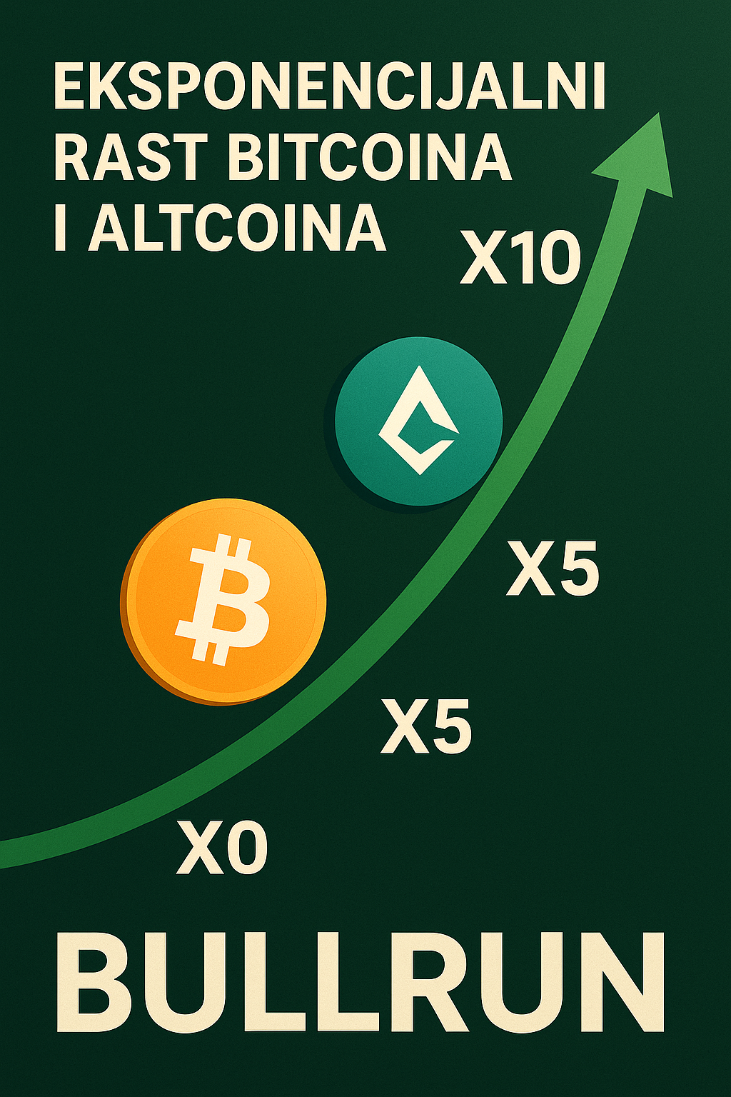 Slika prikazuje zeleni grafikon s krem tekstom EKSPONENCIJALNI RAST BITCOINA I ALTCOINA. Strijela na grafikonu pokazuje rast od X5 do X10. Ikone bitcoina i altcoina prate putanju rasta. Na dnu je riječ BULLRUN, označavajući vremenski period rasta.