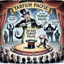 Satirična ilustracija prikazuje kazališnu scenu s temom carina, gdje lik nalik magičaru u smokingu i cilindru, s natpisom TARIFF PARCSE, izvodi trik. Pred njim iz šešira izlazi zbunjeni političar, dok publika, poslovnjaci, promatra situaciju povezanu s izbornim ciklusom i interesima korporacija.