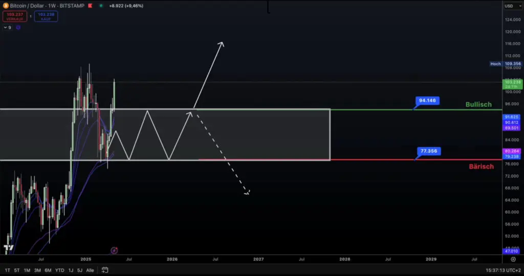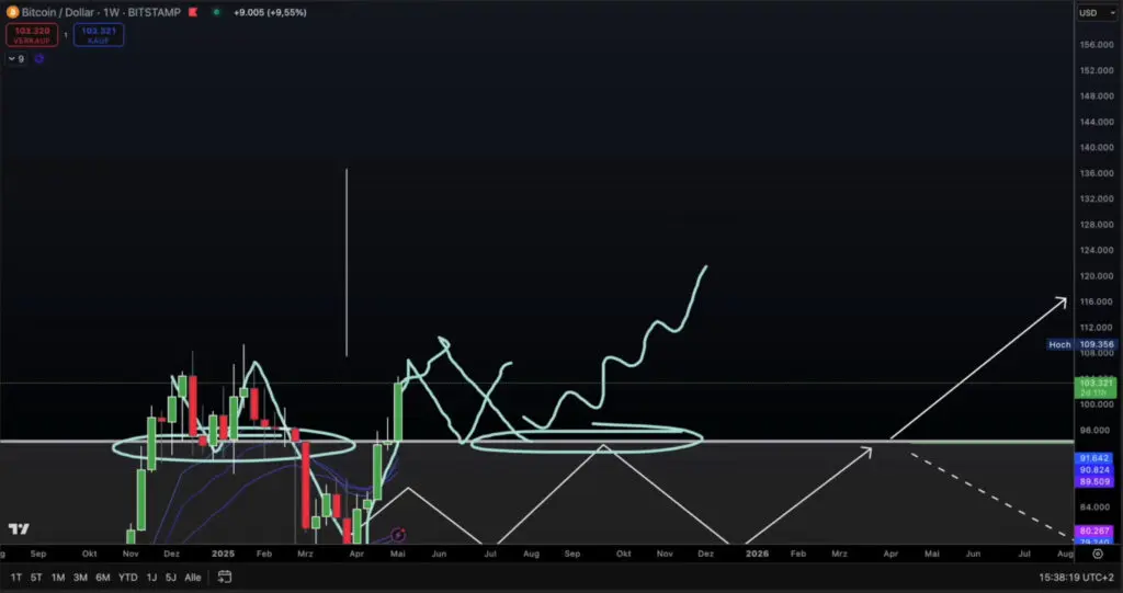 Ako, kao što je prikazano, sada ponovo odemo naviše, i onda dođe do prodaje – 94.000 bi mogla poslužiti kao snažan oslonac. I to smo već vidjeli u prošlosti – ta zona je već jednom bila pouzdan support, i sada bi mogla ponovo da odigra tu ulogu.