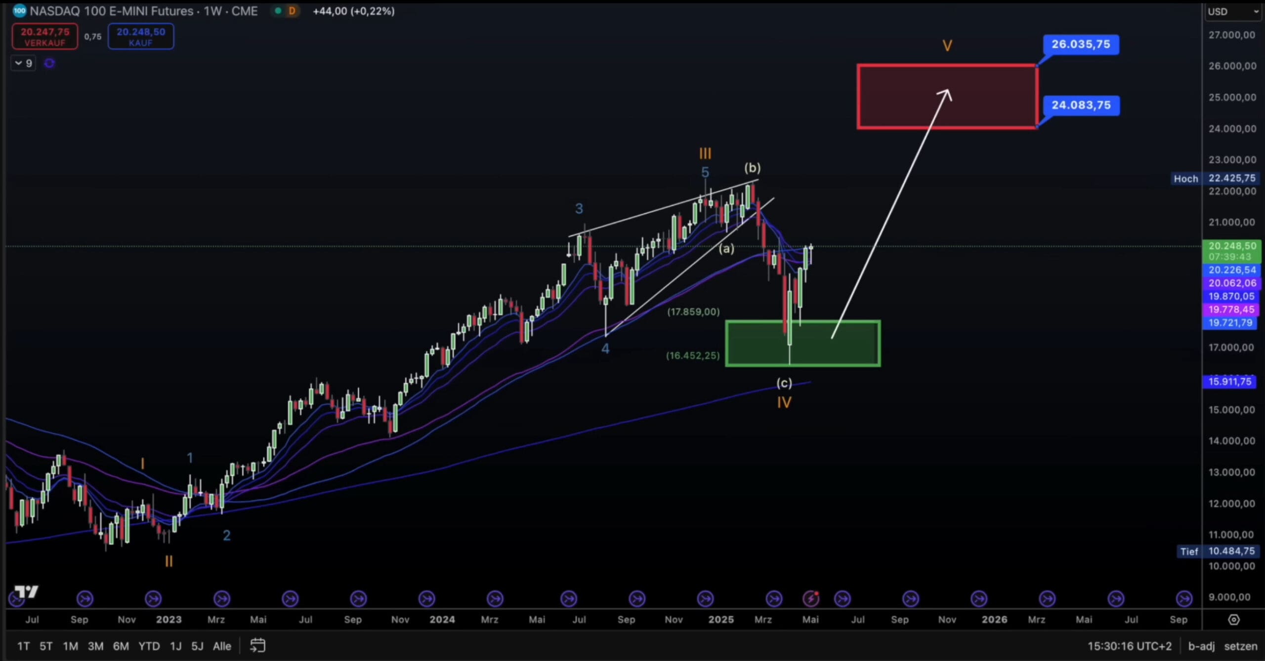 NASDAQ 100 E-mini Futures grafikon prikazuje tjedni vremenski okvir s cijenama Verkauf 20,247.75 i Kauf 20,248.50. Zeleni pravokutnik označava područje potpore, dok crveni označava ciljnu zonu otpora, uz Elliott Wave analizu i pokretne prosjeke.