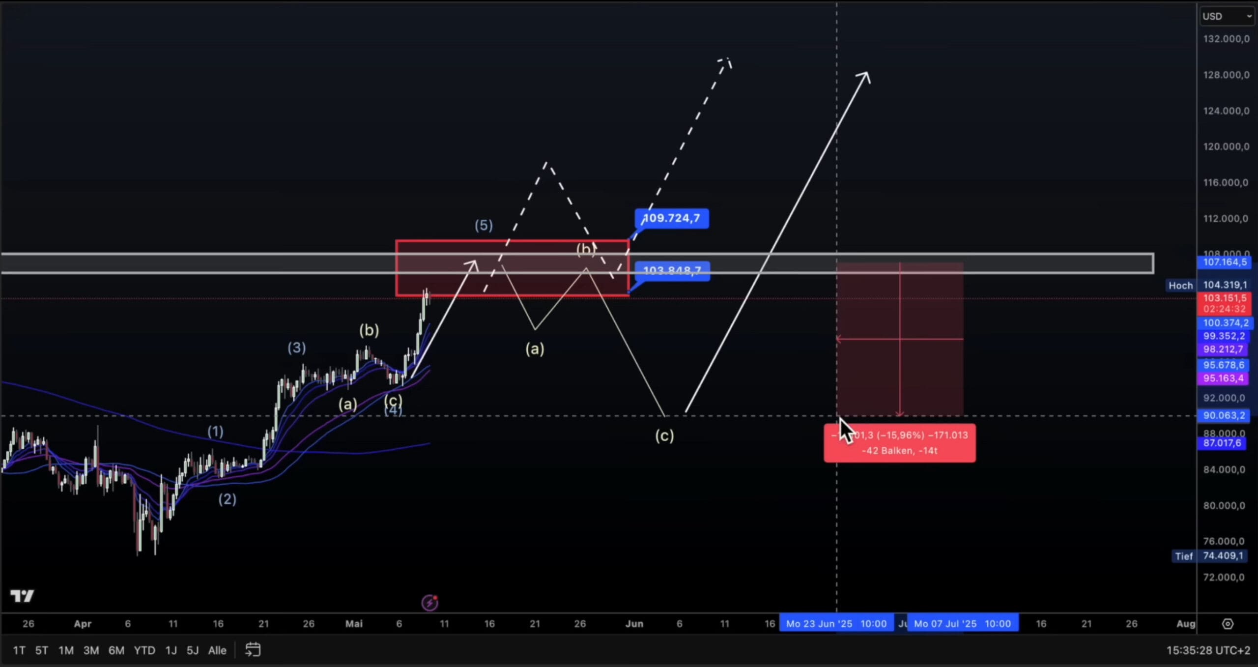 Tehnički grafikon prikazuje kretanje cijena financijskog sredstva od ožujka do kolovoza, s uzlaznim obrascem. Prikazane su svijećnice, Elliott Wave analiza, pokretni prosjeci i otporne razine, uz dodatne linije za predikciju budućih kretanja tržišta.