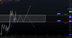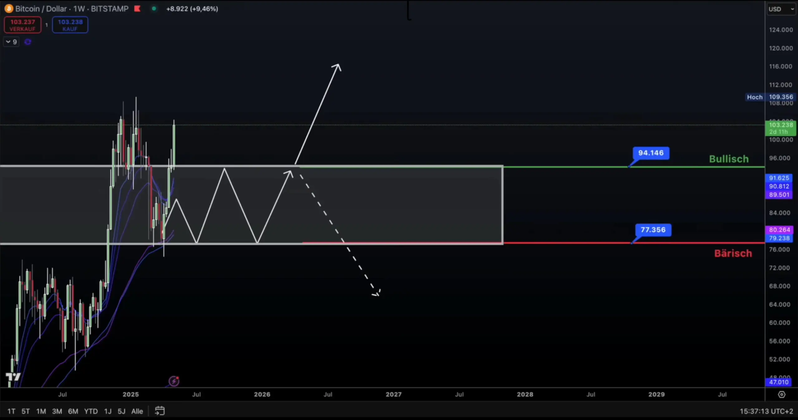 Tjedni grafikon Bitcoin-USD prikazuje kretanje cijena s koristićem svijećnjaka, označavajući bikovske i medvjeđe zone u zelenoj i crvenoj boji. Bijele strelice sugeriraju potencijalne pravce, prati ih pomični prosjeci u nijansama plave i ljubičaste.