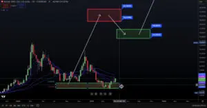 Grafikon prikazuje tjedne kretanje cijena Render (ERC-20) prema američkom dolaru na Coinbase platformi, s candlestick uzorcima, uzlaznim EMA linijama i predviđenim cjenovnim zonama. Prikazane su opcije kupnje i prodaje te vremenska navigacija.