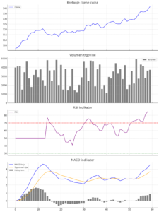 Grafikon prikazuje kretanje cijene kriptovalute s rastućim trendom, raznoliku aktivnost volumena trgovine, RSI koji povremeno ukazuje na prekupovanost, te MACD koji oscilira, sugerirajući volatilnost i moguće prilike za kupnju ili prodaju.