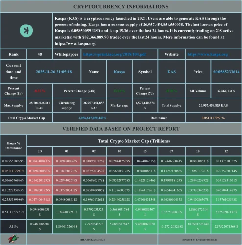 Nadzorna ploča kriptovalute Kaspa (KAS) prikazuje detaljne tržišne podatke: trenutnu cijenu (0.058 USD), 24-satni volumen, tržišnu kapitalizaciju, globalni rank i postotnu dominaciju KAS-a unutar ukupnog kripto tržišta, s zelenim i crvenim indikatorima promjena.