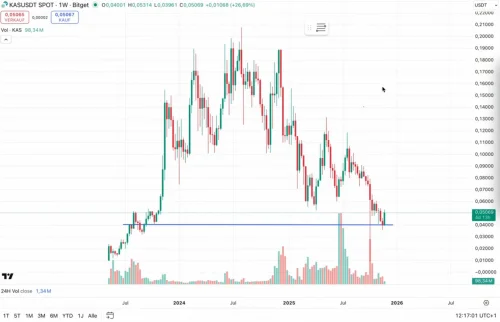 KASUSDT SPOT tjedni grafikon na Bitgetu prikazuje volatilnost cijene kriptovalute od 2023. do 2025. Nakon rasta i pada, cijena od 0.05065 USDT trenutno testira ključnu podršku na 0.0500 USDT, uz prikazani volumen trgovanja.