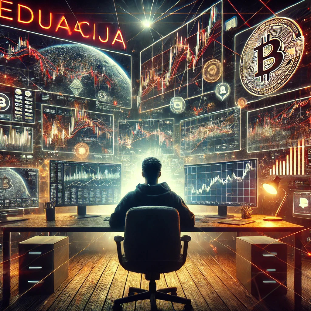 Osoba sjedi za stolom u mračnom prostoru, okružena brojnim ekranima koji prikazuju grafove, dijagrame i simbol Bitcoina. Riječ EDUACIJA sugerira edukaciju o tržištima i kriptovalutama. Atmosfera je futuristička i fokusirana na financijsku analizu.