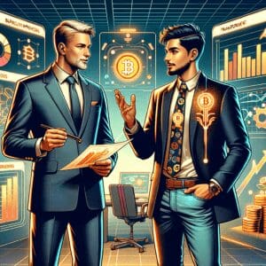 Dva muškarca raspravljaju o kriptovalutama u modernom, futurističkom uredu. Jedan u tamnoplavom odijelu analizira podatke držeći dokumente, dok drugi, u modernom blejzeru s logotipima kriptovaluta, energično objašnjava. Okruženi su digitalnim ekranima s grafikama koje prikazuju tržišne trendove.