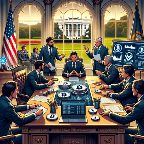 Sastanak u vladinom uredu, nalik Ovalnom uredu, prikazuje raspravu o kriptovalutama. Sudionici u formalnim odijelima okupljeni su oko drvenog stola, dok digitalni ekran iza njih prikazuje podatke o tržištu. Atmosfera je ozbiljna uz naglasak na inovacijama i tehnologiji.