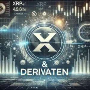 Slika prikazuje futuristički dizajn s metalnim simbolom X unutar kružnog okvira, okruženim grafikonima tržišnih podataka XRP-a. Svijetlosni elementi, geometrijski uzorci i mrežasta pozadina ističu analizu financijskih trendova i digitalnih derivata vezanih uz XRP.