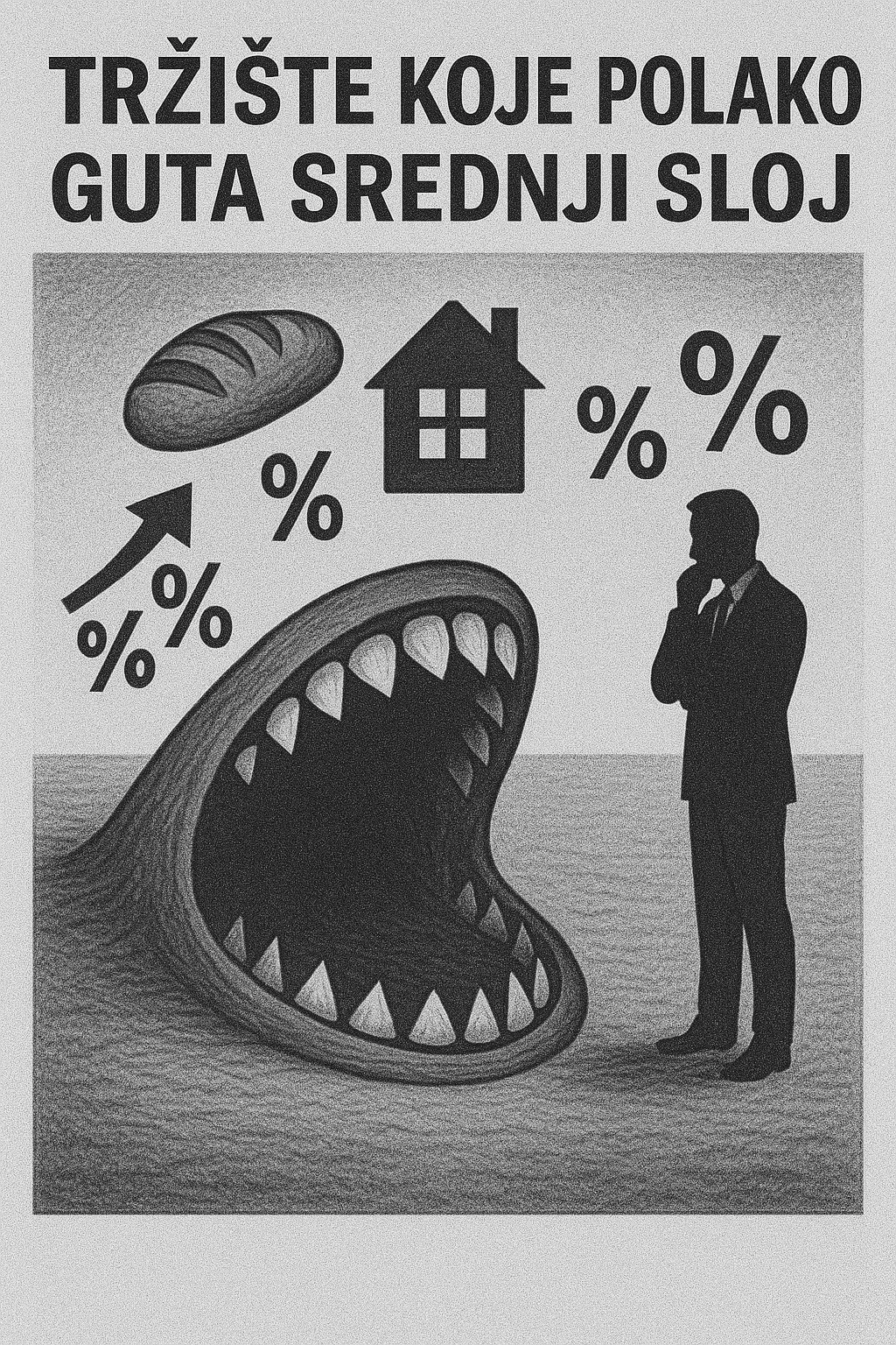 Karikatura: Zastrašujuća čeljust tržišta guta simbole kruha i kuće uz znakove rasta cijena. Zabrinuti muškarac promatra ekonomski pritisak na srednji sloj.