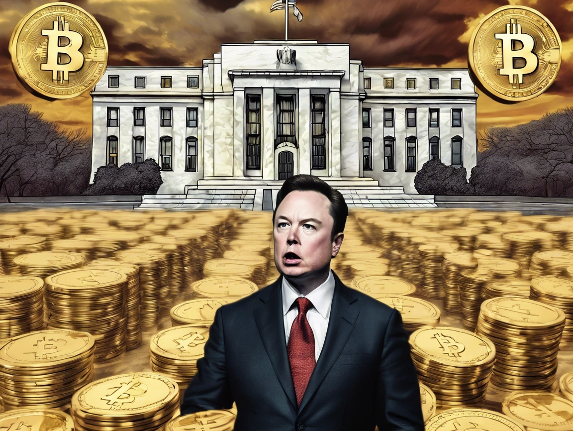 Slika prikazuje poslovnog lidera u odijelu s crvenom kravatom, stojeći ispred zlatnih kovanica s Bitcoin simbolima, uz impozantnu neoklasicističku zgradu. Ova scena odražava moć i bogatstvo u svijetu kriptovaluta i tradicionalnih financija, s dramatičnim oblacima u pozadini.