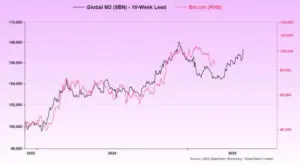 Grafikon prikazuje kretanje globalne M2 ponude novca i cijena Bitcoina od 2023. do 2025., s uočenim korelacijama i volatilnošću Bitcoina. Vrijednosti i vremenski okvir jasno su naznačeni, dok pozadina u nijansama ružičaste ističe trendove.