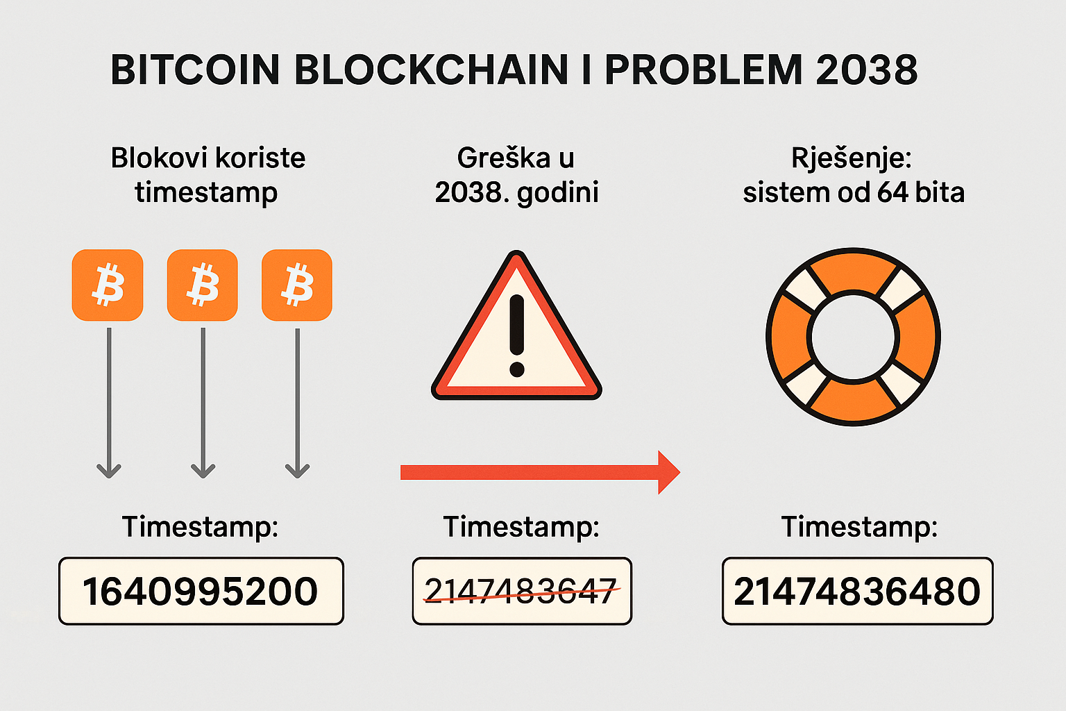 Ilustracija objašnjava Bitcoin problem 2038. godine. Prikazuje kako blokovi koriste 32-bitne timestampove, upozorava na grešku prekoračenja broja, te nudi rješenje prelaskom na 64-bitni sistem za trajno otklanjanje problema.