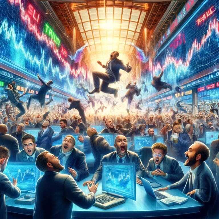 Scena prikazuje užurbani burzovni trg, gdje skupina trgovaca strastveno komunicira oko stola dok prate fluktuacije tržišta. Osvijetljeni velikim ekranima s grafikonima, prostor isijava energiju i napetost tipične za dinamično financijsko tržište.