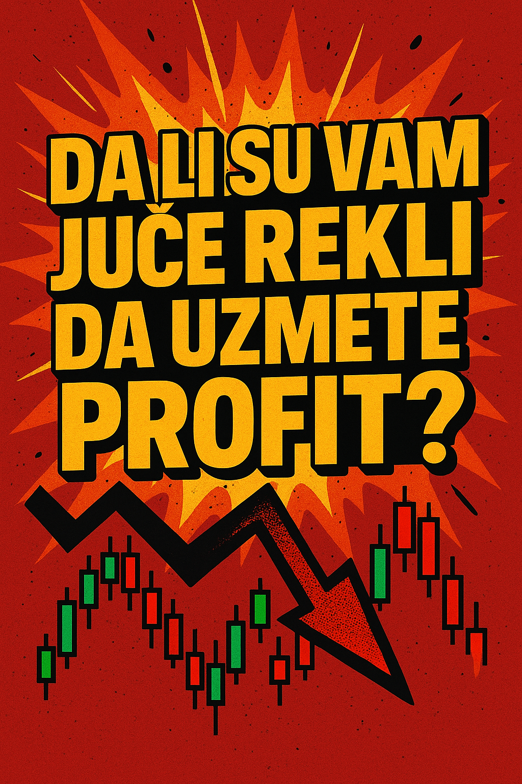 Slika prikazuje crvenu eksplozivnu pozadinu, veliki žuti natpis DA LI SU VAM JUČE REKLI DA UZMETE PROFIT? i candlestick grafikon koji oštro pada, ističući iznenadni pad na financijskom tržištu.