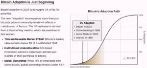 Slika prikazuje diskusiju o usvajanju Bitcoina s grafom koji prati početnu fazu usvajanja do 2025. Uz grafik s S-krivuljom su predstavljeni podaci o podzastupljenosti u investicijama te globalnom vlasništvu Bitcoina, uz logotip tvrtke River.