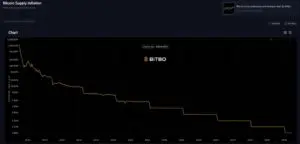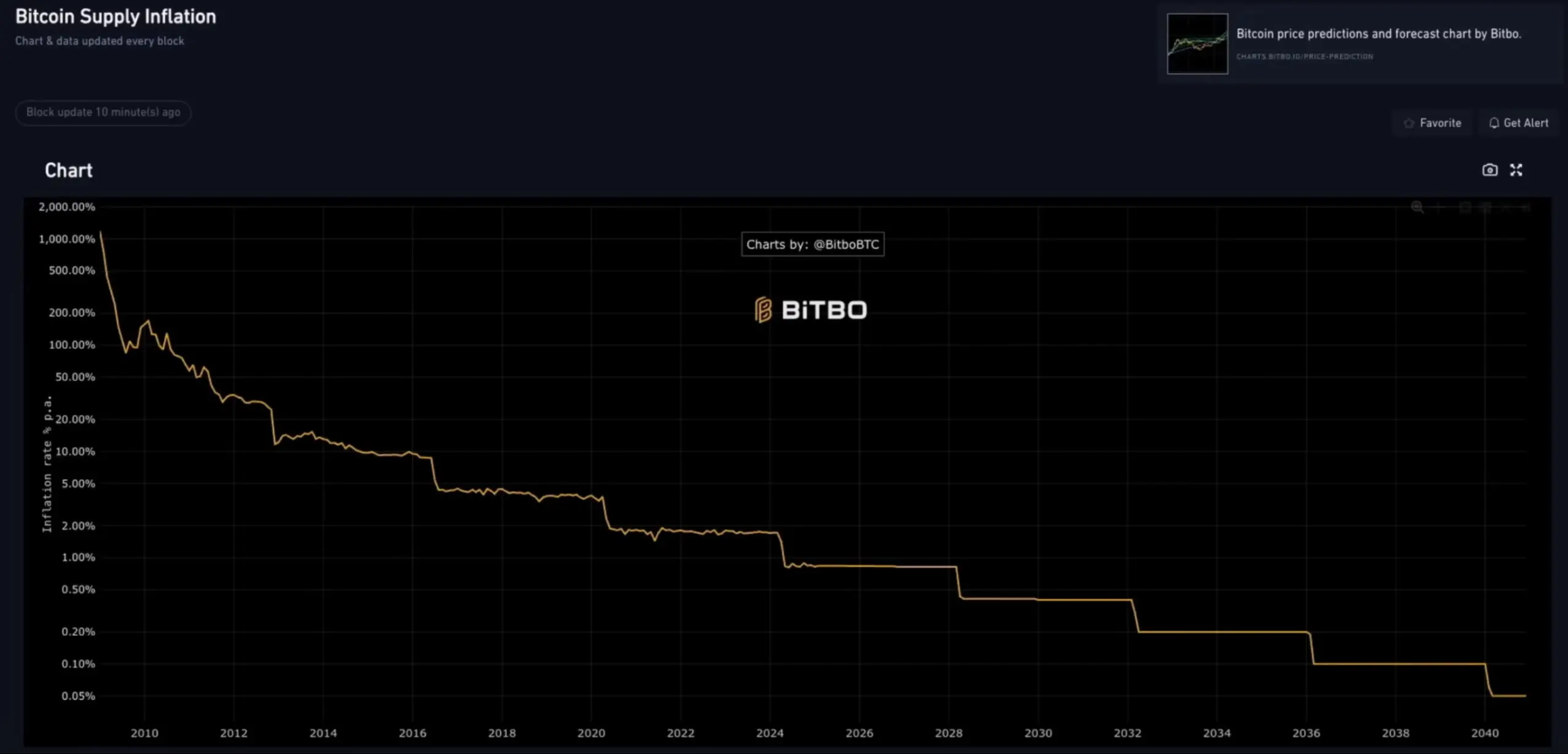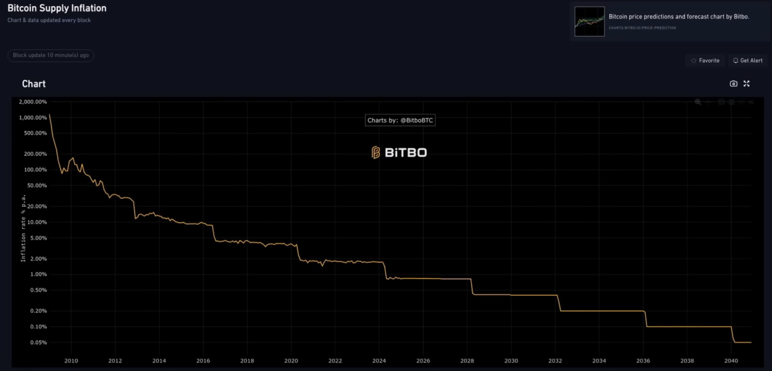 Grafikon prikazuje povijesnu i predviđenu stopu inflacije Bitcoina od 2009. do 2040. godine, s padom inflacije zbog halvinga u 2012., 2016., 2020., i budućim intervalima. Stopa inflacije opada, približavajući se nuli do 2040., što naglašava deflacijski dizajn Bitcoina.