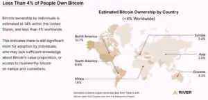 Svjetska karta u boji prikazuje procijenjeno vlasništvo Bitcoina po zemljama, s Sjevernom Amerikom na vrhu (10,7%), dok su Europa (3,4%) i Azija (3,6%) na sličnim razinama. Karta ilustrira razlike u usvajanju Bitcoina diljem svijeta.