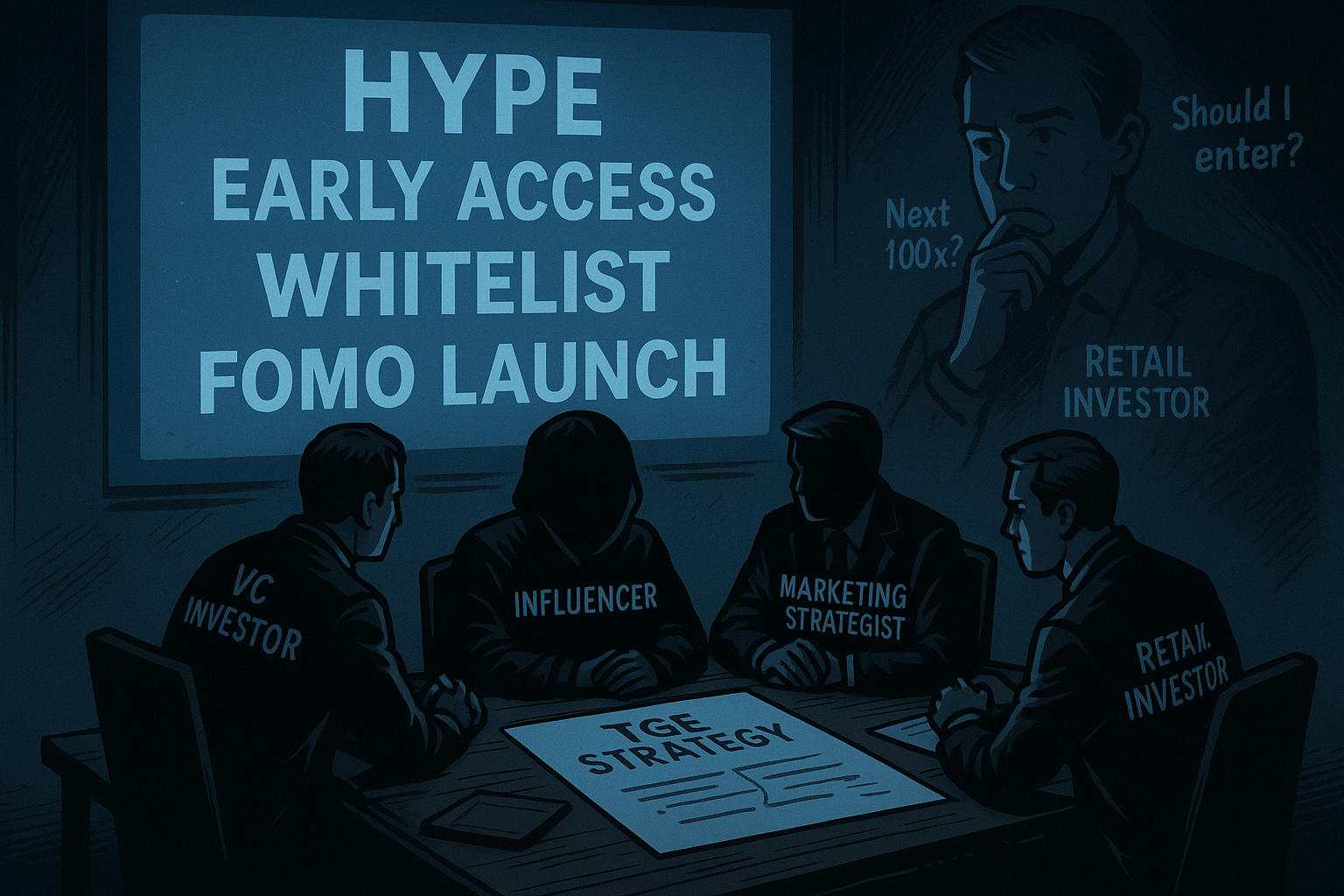 VC fondovi i influenceri planiraju FOMO strategiju za kripto projekt dok retail promatra sa strane.