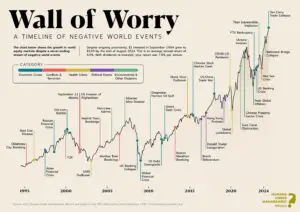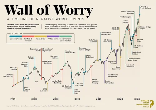 Grafikon prikazuje rast MSCI svjetskog indeksa od 1994. do 2024. uz vremensku crtu najvažnijih negativnih svjetskih događaja, ističući otpornost tržišta dionica unatoč brojnim krizama i nesigurnostima.