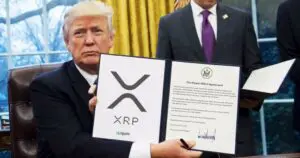 Na slici se vidi čovjek u odijelu kako drži dokument s XRP logotipom u službenom okruženju, sugerirajući potpisivanje važnog Ripple ugovora. Druga osoba u formalnom odijelu stoji pored njega, dok prirodna svjetlost ulazi kroz prozor, ističući značaj događaja.