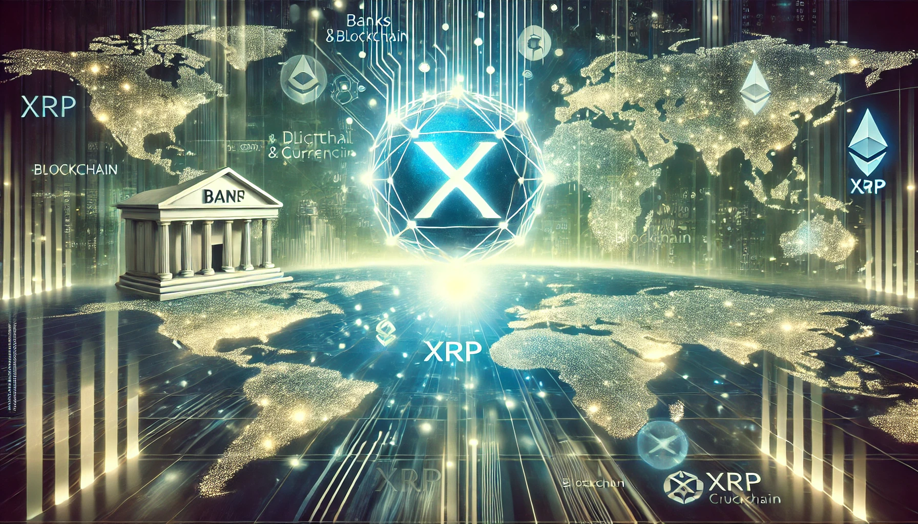 Digitalna ilustracija prikazuje spoj blockchain tehnologije i globalnih financija. U središtu je svijetla sfera s oznakom X, okružena mrežom koja simbolizira kriptovalute. Klasična banka s natpisom BANK s lijeve strane kontrastira modernim digitalnim elementima, dok se simboli XRP i Ethereum nalaze u pozadini, naglašavajući integraciju digitalnih valuta u tradicionalne financijske sustave.