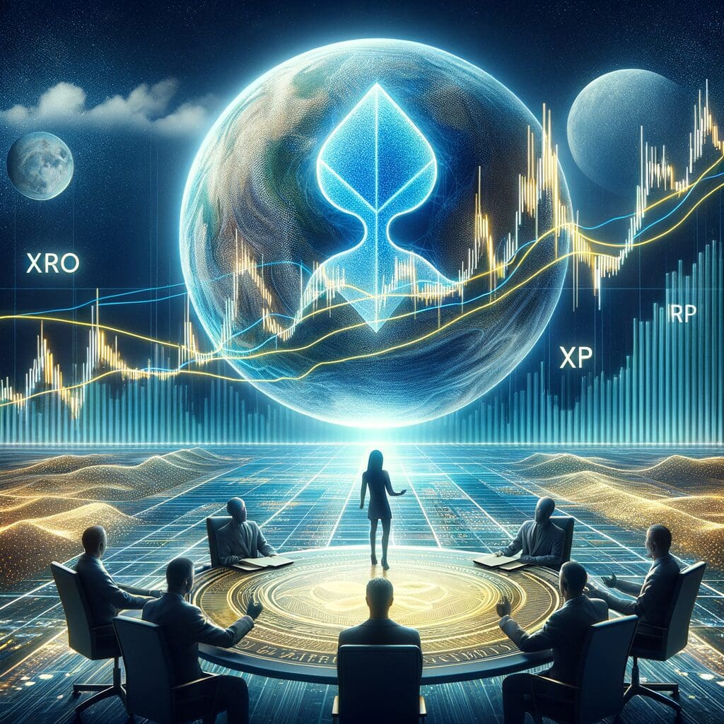 Futuristički financijski sastanak prikazuje skupinu stručnjaka oko kružnog stola, koji analiziraju virtualne valute i inovacije. U pozadini, sjajna globus simbolizira ključne tržišne trendove, dok složeni grafikon prikazuje dinamično tržišno okruženje.