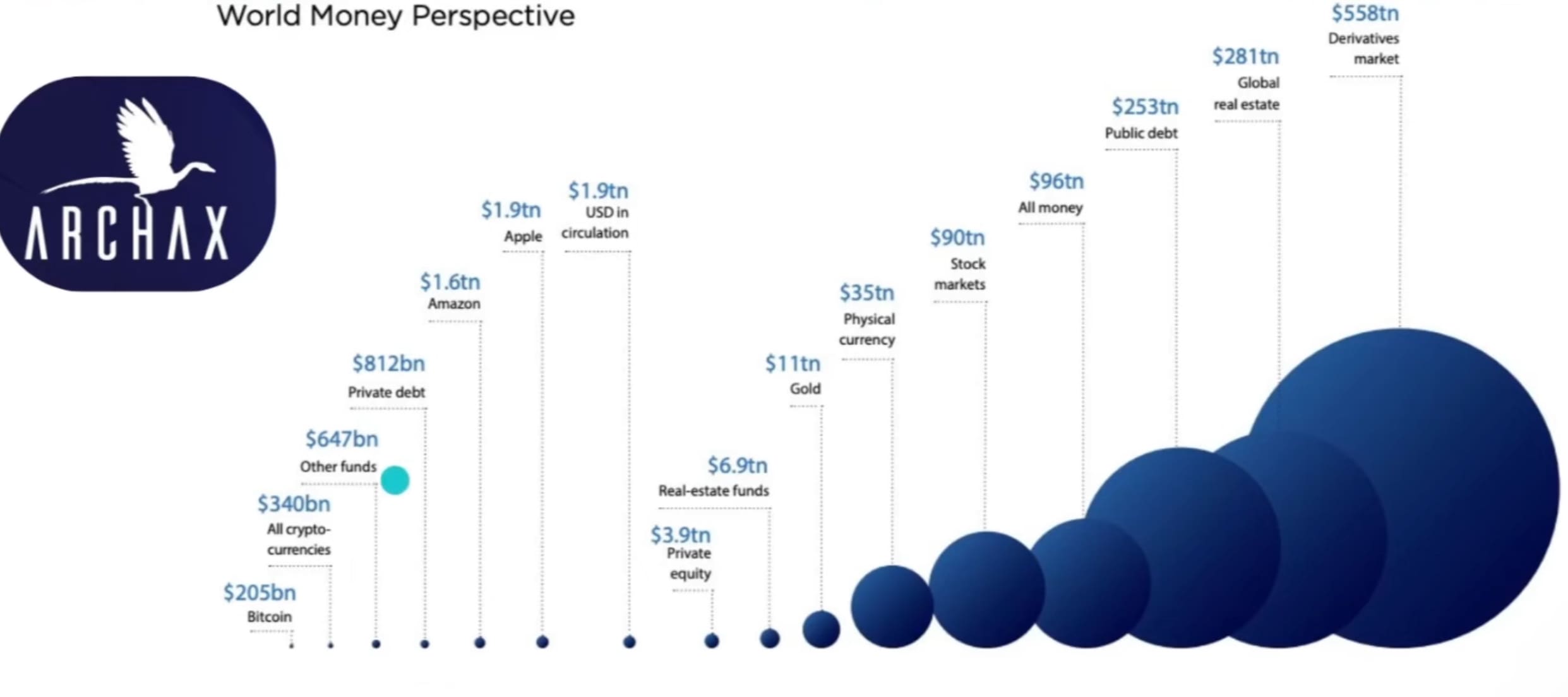 Vizualizacija Svjetski novčani perspektiv prikazuje usporedne veličine financijskih sredstava globalne ekonomije kroz krugove proporcionalne njihovim vrijednostima, od Bitcoin-a do tržišta derivata, ističući značaj različitih financijskih kategorija u trilijunima i milijardama dolara.