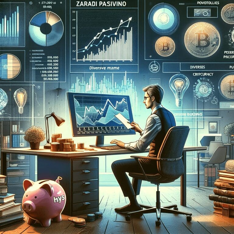 Slika prikazuje financijskog analitičara u poslovnom prostoru s više monitora koji prikazuju grafove i trendove. Muškarac u plavoj košulji analizira podatke, okružen knjigama, lampom i globusom, dok hologrami ilustriraju suvremene financijske instrumente i kriptovalute.