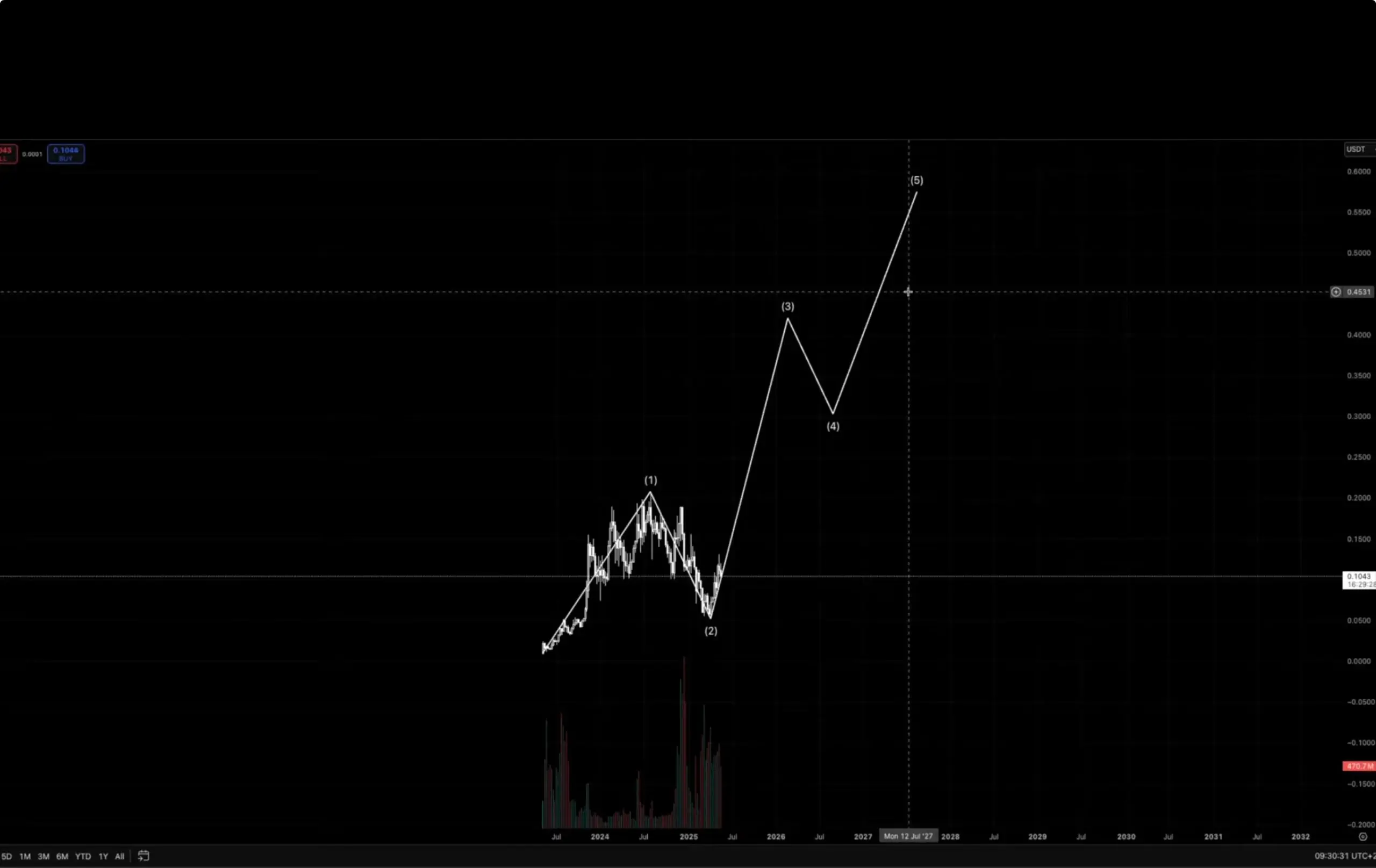 Tehnički grafikon kriptovalute prikazuje Elliott Wave analizu s pet valova, projekcijom rasta cijene do 2028. Prikazane su svijeće, volumen trgovanja i ključne razine otpora u USDT, na crnoj podlozi trading platforme.