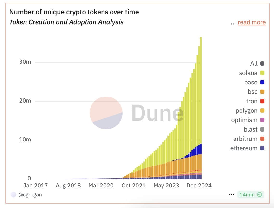 Ovaj brzi rast fragmentirao je pozornost ulagača i razvodnio alokaciju kapitala. Platforme kao što su Solana , Ethereum i Polygon i dalje dominiraju stvaranjem tokena, ali ogromna ponuda novih projekata otežava pojedinačnim tokenima da steknu privlačnost. Kako sve više tokena preplavljuje tržište, pojavljuju se pitanja o kvaliteti, korisnosti i dugoročnoj održivosti, što ulagačima otežava razlikovanje obećavajućih altcoina od prolaznih trendova. Moglo bi se reći da je to jedan od razloga zašto kapital presušuje.