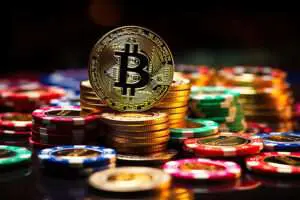 Bitcoin with colorful gambling chips for crypto casino illustrat
