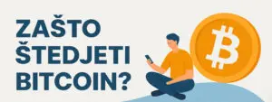 Na slici mladić sjedi s mobitelom pored velikog zlatnog Bitcoin znaka, dok lijevo stoji natpis ZAŠTO ŠTEDJETI BITCOIN?, ističući temu štednje Bitcoina kroz moderan i minimalistički dizajn.