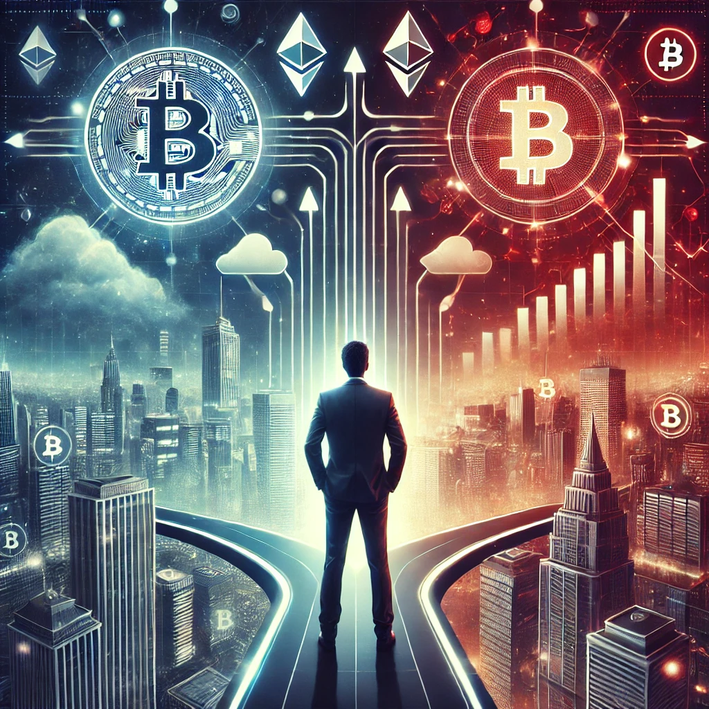 Prikazan je grad podijeljen na plavu futurističku i crvenu dinamičnu stranu, s čovjekom u odijelu na raskrižju između njih. Obje strane ističu Bitcoin simbole, dok grafovi i strelice simboliziraju rast, naglašavajući odluku u svijetu kriptovaluta.