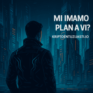 Futuristički cyberpunk grad noću s osvijetljenim neboderima i muškarcem u jakni s neon uzorkom koji promatra horizont. Natpis na hrvatskom „MI IMAMO PLAN A VI?“ ističe kripto entuzijaste i digitalnu zajednicu.