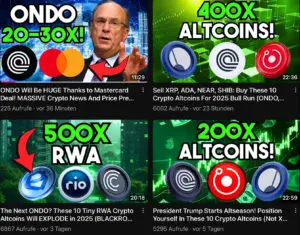 Četiri sličice kripto videa prikazuju šarene i upečatljive naslove kao 20-30X, 400X, 500X, 200X, naglašavajući potencijalni rast kriptovaluta. Ističu se teme kao ONDO-Mastercard partnerstvo te preporuke za investiranje u altcoine.