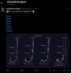 Post na društvenim mrežama od KriptoEntuzijast pokazuje grafikon Bitcoin Cycles s povijesnim i projektnim cijenama Bitcoina za razdoblja 2011-2012, 2014-2016, 2019-2020, te 2022-2024. Naglašava The Banana Zone s optimističnim prognozama za kriptovalute.