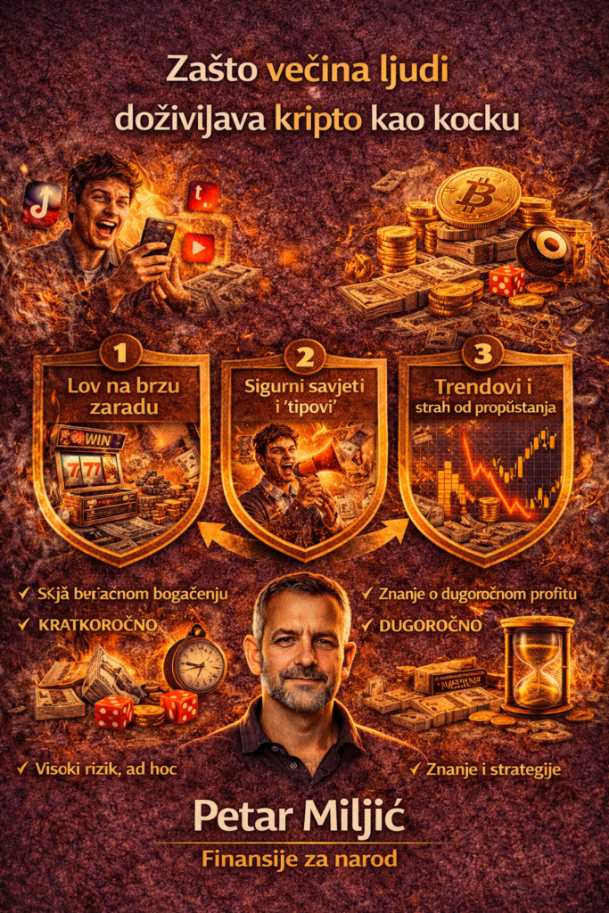 Četvrti razlog je mentalitet brzog bogaćenja. Mnogi ulaze u kripto zato što žele nešto što im klasični finansijski sistemi ne daju: instant prečicu do bogatstva. Ali potraga za brzom zaradom je suština kocke. Isti mentalni obrazac koji tjera ljude da kupuju loto tikete i klade se na sportske događaje, gura ih u memecoine, shitcoine i projekte koji obećavaju brza x100 čuda. Kripto dozvoljava da se veliki skokovi dese, ali ne zato što je to pravilo – već zato što tržište nagrađuje ranu fazu tehnologije. Ko juri skok, juri iluziju. Ko gradi dugoročno, koristi realni potencijal.