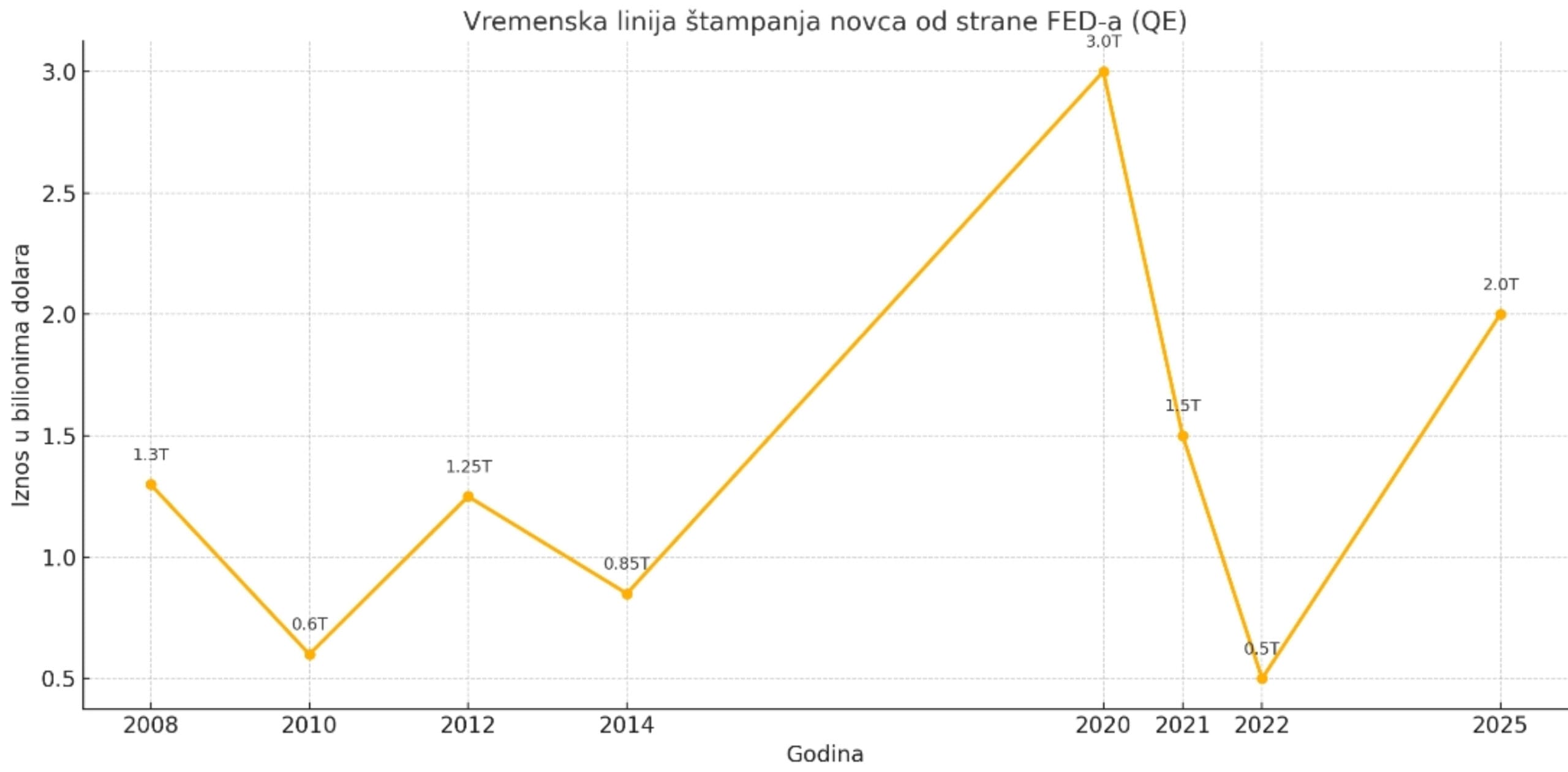 Grafikon prikazuje vremensku liniju tiskanja novca FED-a od 2008. do 2025. godine u okviru kvantitativnog popuštanja. Fluktuacije iznose od 0,5 do 3 trilijuna dolara, s ključnim promjenama u 2008., 2010., 2012., 2014., 2020., 2022. i 2025. godini.